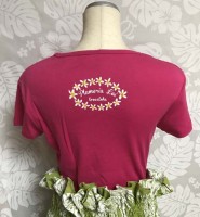 HULAガールの周りを、二色使いの華やかなプルメリアで囲み、HAPPYな雰囲気なデザインです。後ろプリントはプルメリアのレイがプリントされております。